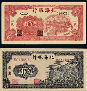 在抗戰(zhàn)勝利結(jié)束時(shí),山東解放區(qū)已有極大發(fā)展,有12.5萬平方公里的面積,占山東總面積的92%,擁有2400萬人口,占山東總?cè)丝诘?0%。1948年10月,山東的北海銀行幣與華北的冀南銀行幣、晉察冀邊區(qū)幣固定比價(jià)互相流通,1948年11月16日起,北海銀行幣與華中銀行幣等價(jià)流通。這一時(shí)期的北海銀行幣均不加蓋地名,便于山東以外的地區(qū)流通。1948年12月1日,華北銀行、北海銀行、西北農(nóng)民銀行合并,在石家莊成立中國人民銀行,但因工作的需要,北海銀行繼續(xù)營業(yè),1949年1月底開始回收北海銀行幣,同年11月1日改稱中國人民銀行山東分行,至此,北海銀行完成了它的歷史使命宣告結(jié)束。