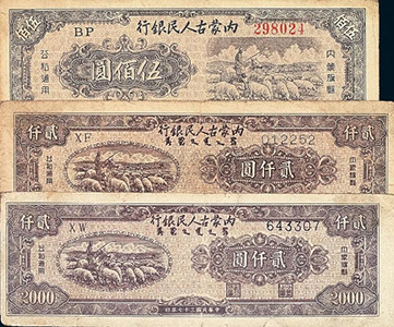 抗日戰(zhàn)爭勝利后,內(nèi)蒙古人民最早實(shí)現(xiàn)了民族區(qū)域自治,1946年,東蒙古人民自治政府在烏蘭浩特成立,開始印發(fā)“人民自治政府政府暫行流通券”,起初在東北范圍內(nèi)流通。1947年5月,內(nèi)蒙古自治區(qū)人民政府成立,流通券改名為內(nèi)蒙幣,并逐漸進(jìn)入到原蒙疆地區(qū)開始流通,成為內(nèi)蒙古地區(qū)百姓常用貨幣。
