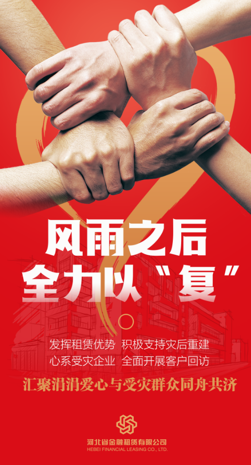 風(fēng)雨之后,是災(zāi)后重建的關(guān)鍵時(shí)期。河北省金融租賃有限公司(以下簡稱“河北金租”或“公司”)全力落實(shí)各級(jí)政府及監(jiān)管部門的決策部署,及時(shí)出臺(tái)針對(duì)性政策,迅速投身災(zāi)后重建工作,積極幫助受災(zāi)地區(qū)企業(yè)解難紓困,以實(shí)際行動(dòng)踐行金融工作的…
